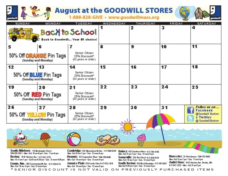 Our goodwill store & donation centers offer 50% off all merchandise that is. Use the controls below to filter the events that appear on your calendar. On this day there are no special events and evergreen goodwill stores are keeping normal hours. Web check our monthly tag sale calendar below or sign up to receive our weekly email newsletter and.