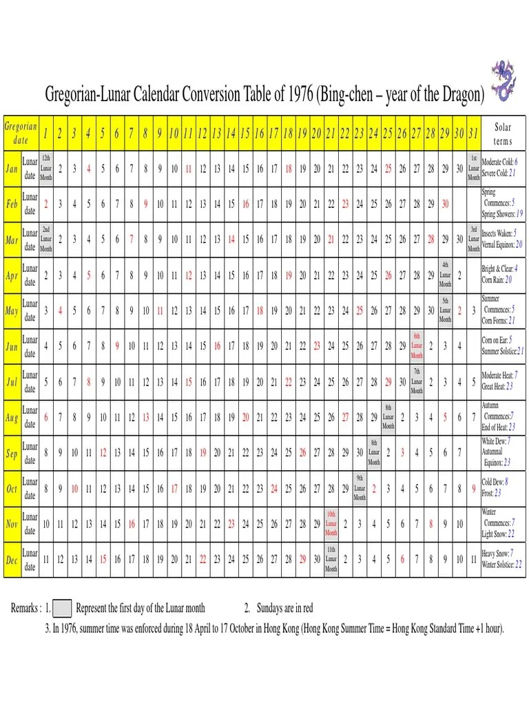 GregorianLunar Calendar Conversion Table of 1976 (BingChen Year of