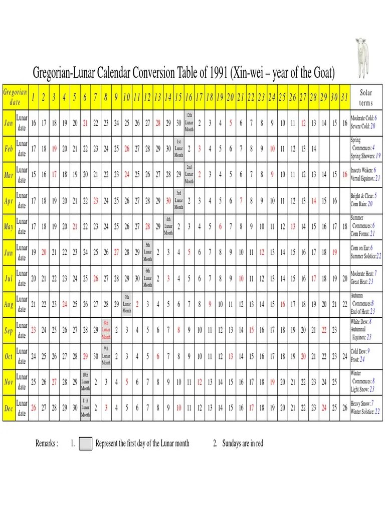 GregorianLunar Calendar Conversion Table of 1991 (XinWei Year of